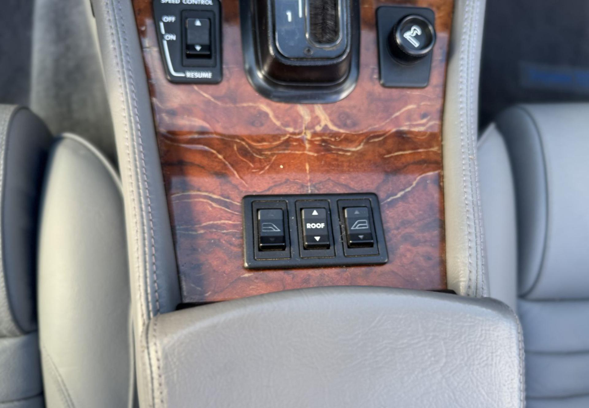 Gli interni in pelle grigio chiaro creano un contrasto raffinato con il blu esterno, amplificando la sensazione di luminosità e lusso. La qualità dei materiali, la plancia rivestita, le finiture in legno e l’impostazione orientata al comfort raccontano un’epoca in cui Jaguar puntava a un’eleganza discreta ma profondamente esclusiva.